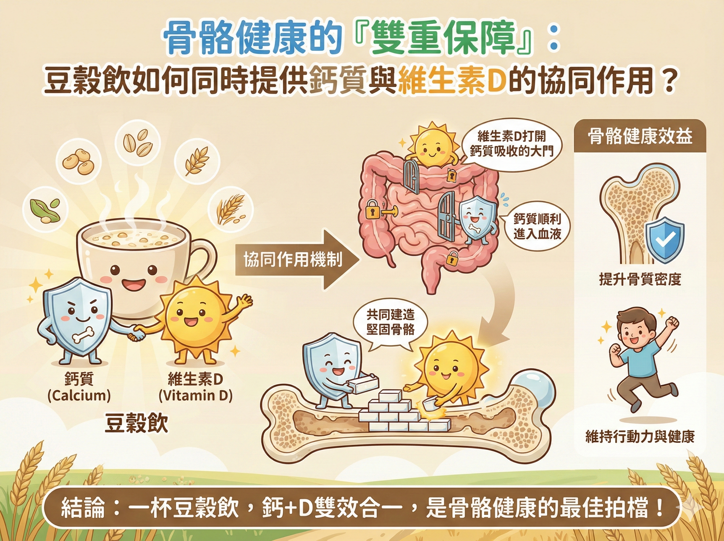 Q029 骨骼健康的「雙重保障」: 豆穀飲如何同時提供鈣質與維生素D的協同作用?