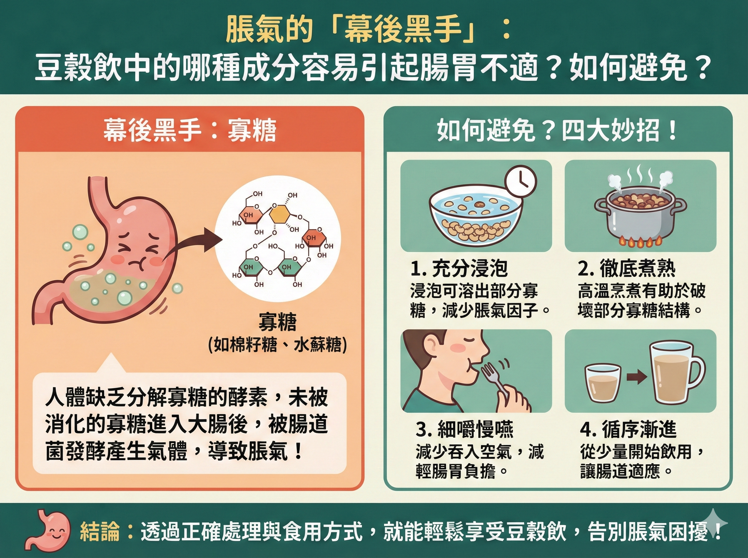 Q018 脹氣的「幕後黑手」: 豆穀飲中 的哪種成分容易引起腸胃不適? 如何避免?